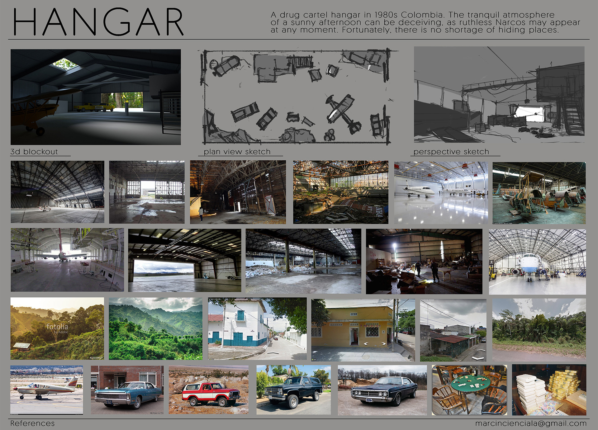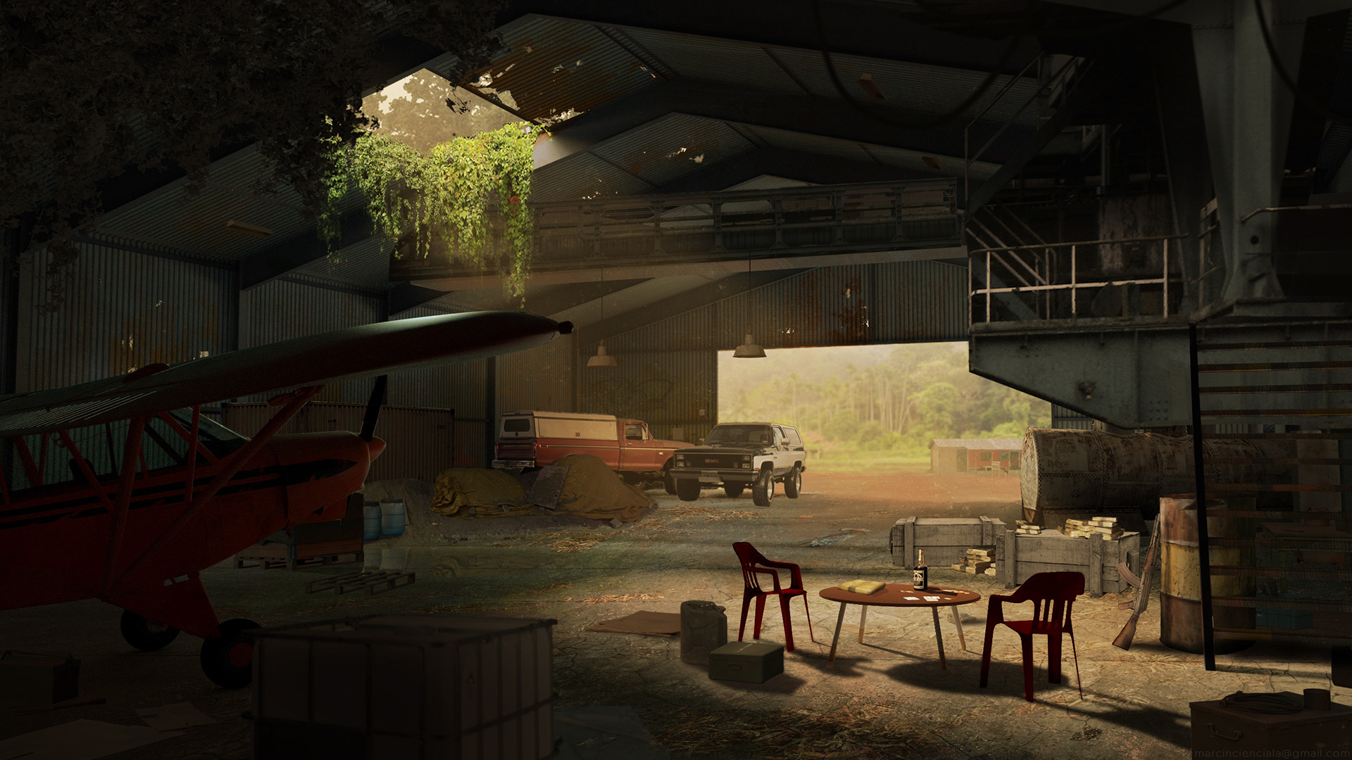 A drug cartel hangar in 1980s Colombia. The tranquil atmosphere of a sunny afternoon can be deceiving, as ruthless Narcos may appear at any moment. Fortunately, there is no shortage of hiding places.
